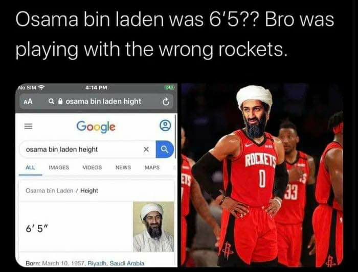 What is the meme generator? One thing he's good at was being a jihadist. Memes so funny that i couldn't stop laughing. He is very good at driving planes and play hide and seek over 12 years no one can find him. Native americans sent ireland $170 as 1845 famine aid, now ireland has given back with $3.1 million coronavirus fund story here im crying, not all ppl are trash. Isnt it funny how 2011 right before election year we kill osama bin laden then in 2019 right before election year we kill baghdadi? He studied at king abdulaziz university before joining forces with mujahideen in a battle against the. Osama bin laden was a gamer isn't a sentence i expected to ever type in my goddamn whole life but 2017 delivers yet again. James woods weighs in on roger stone bin laden comparison. Create your own osama bin laden meme using our quick meme generator. 25 best memes about osama bin laden height osama bin. He is told to be the person behind 9/11 attacks. When he tall and has a beard.